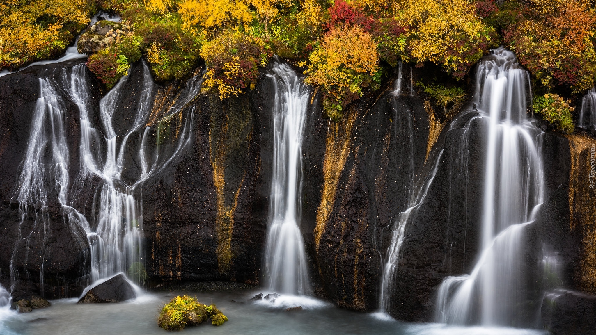 Edytor tapety: Jesienne krzewy przy wodospadzie Hraunfossar w Islandii
