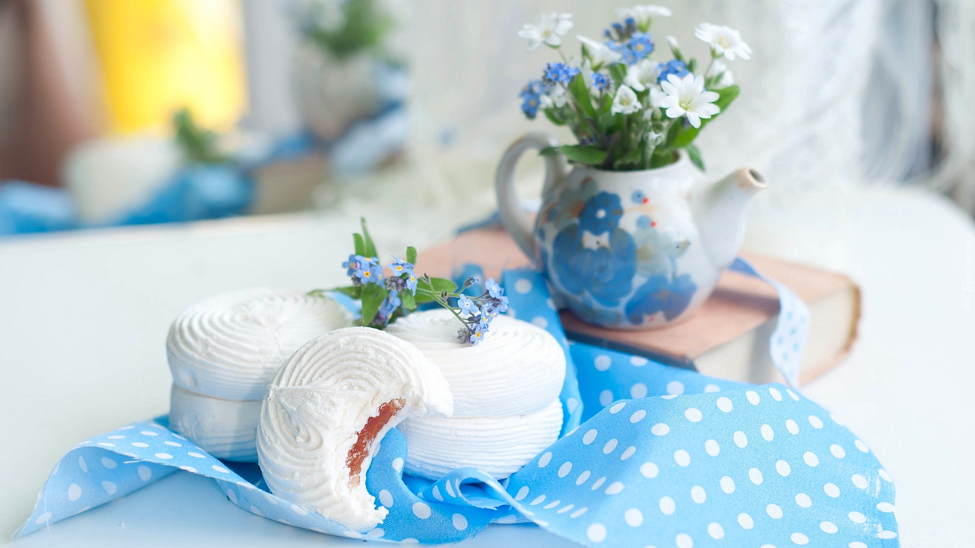 Edytor tapety: Bezy obok dzbanuszka z niezapominajkami