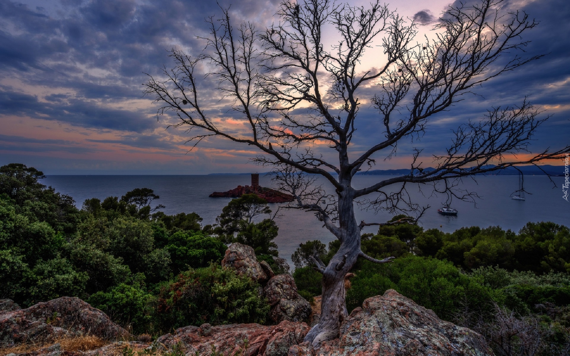 Edytor tapety: Widok zza drzewa na morze i wysepkę