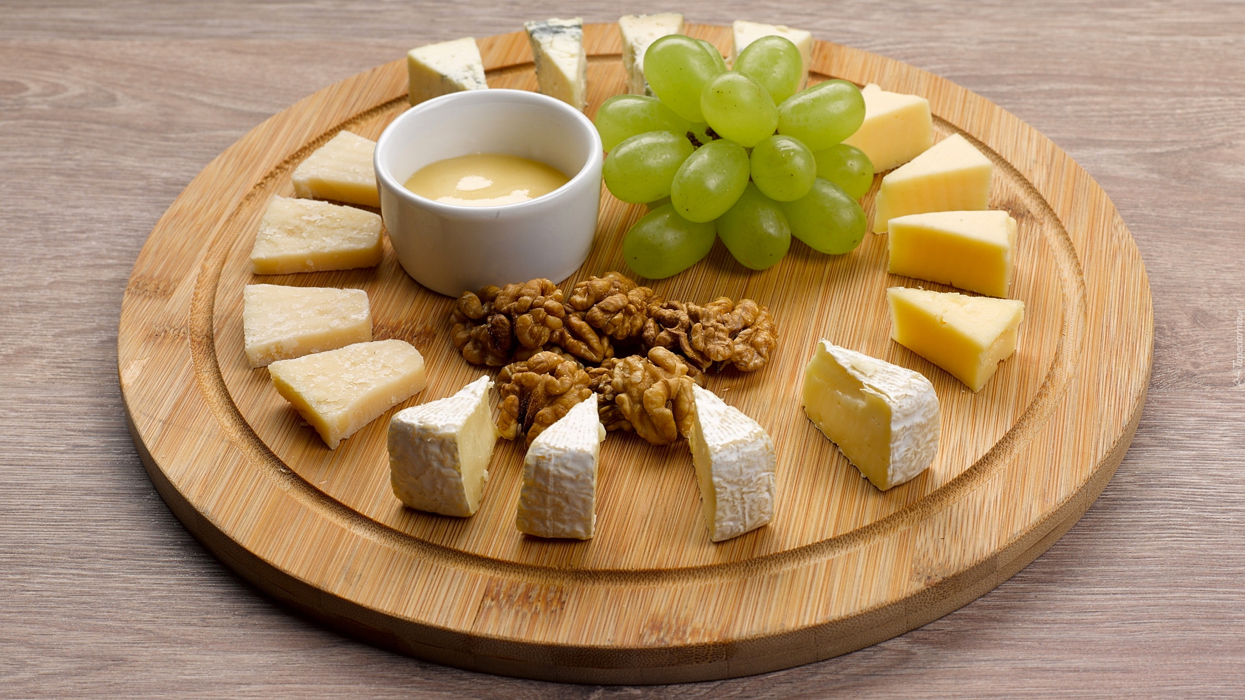 Edytor tapety: Orzechy i winogrona pośrodku kawałków sera
