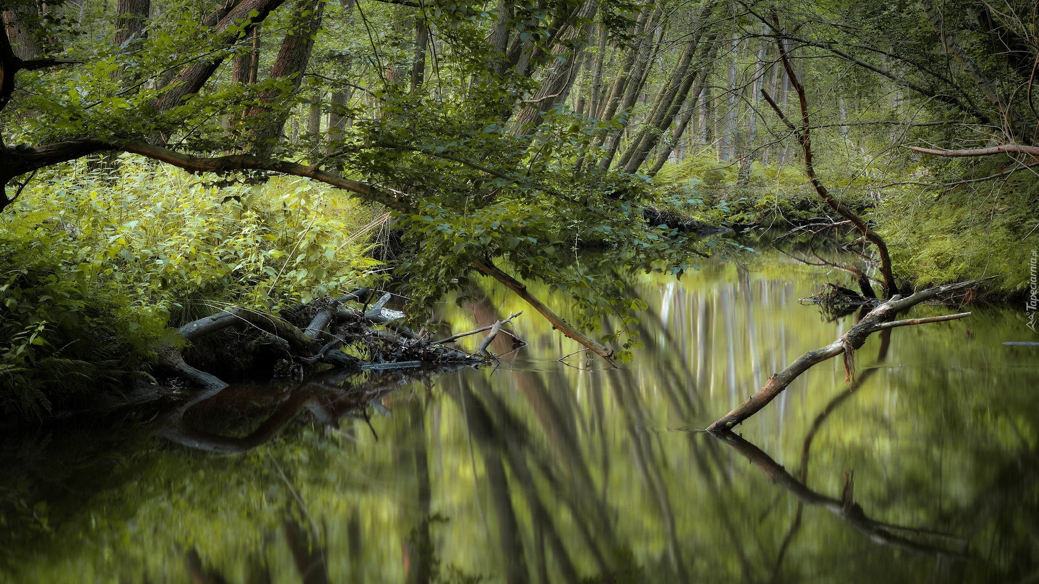 Edytor tapety: Drzewa i zielone rośliny w lesie nad stawem