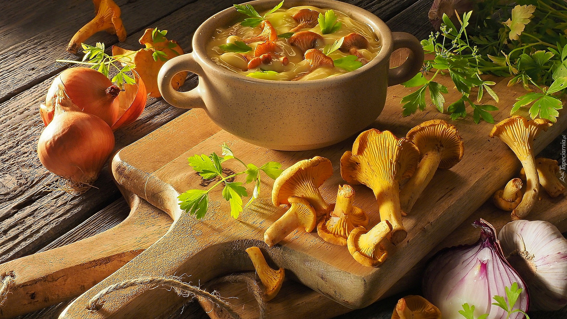 Edytor tapety: Zupa grzybowa obok kurek i cebuli