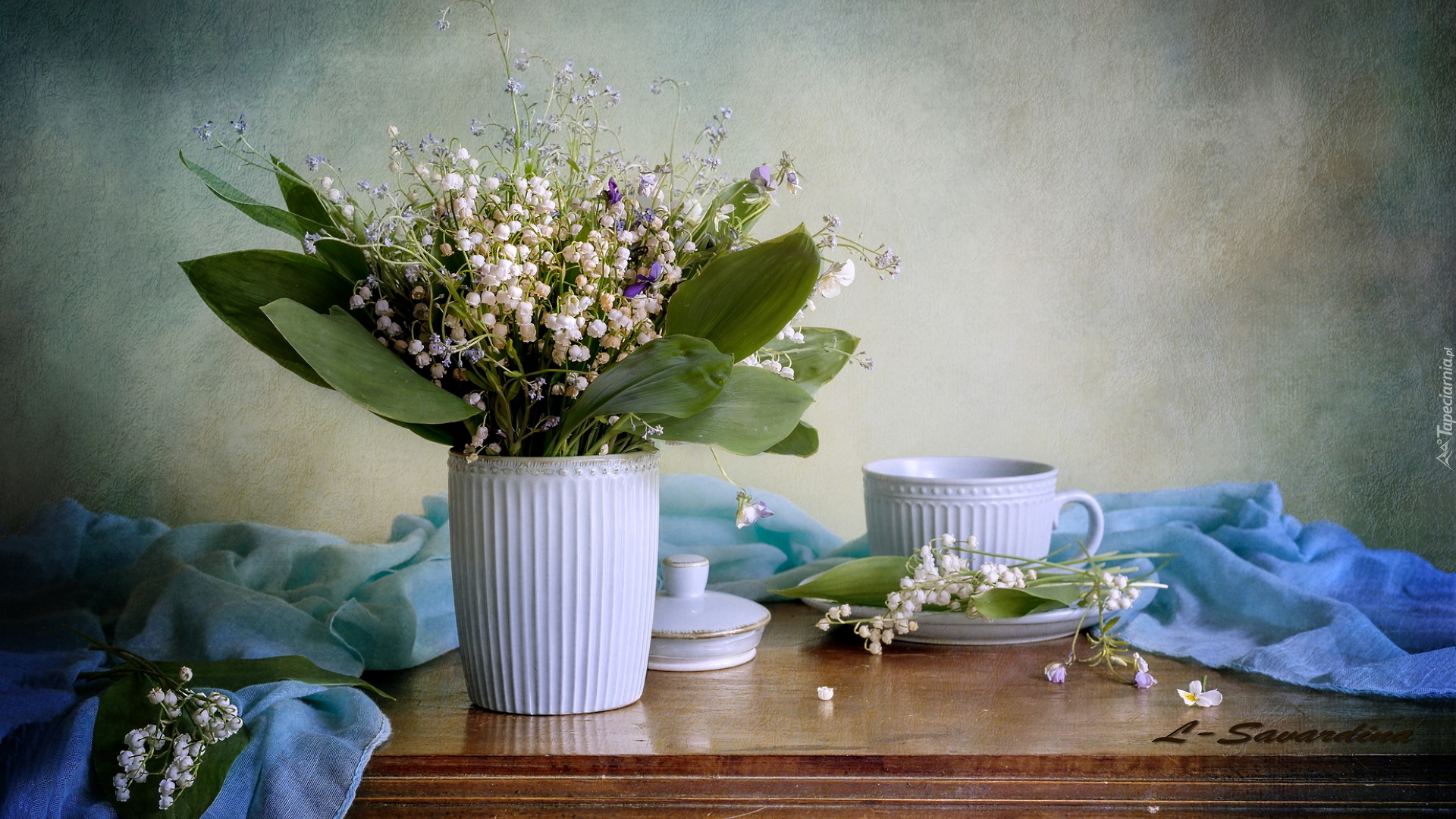 Edytor tapety: Konwalie majowe w wazonie obok filiżanki