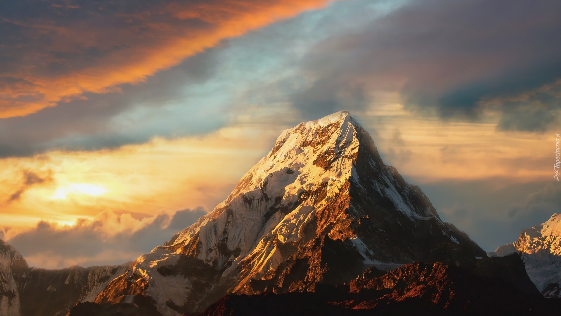 Edytor tapety: Kolorowe niebo nad rozświetlonym szczytem góry