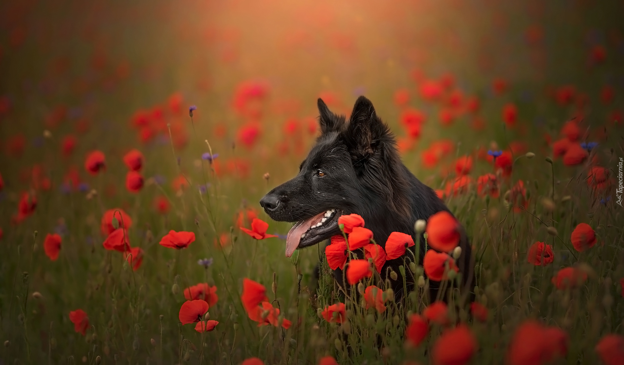 Edytor tapety: Czarny owczarek niemiecki pośród maków