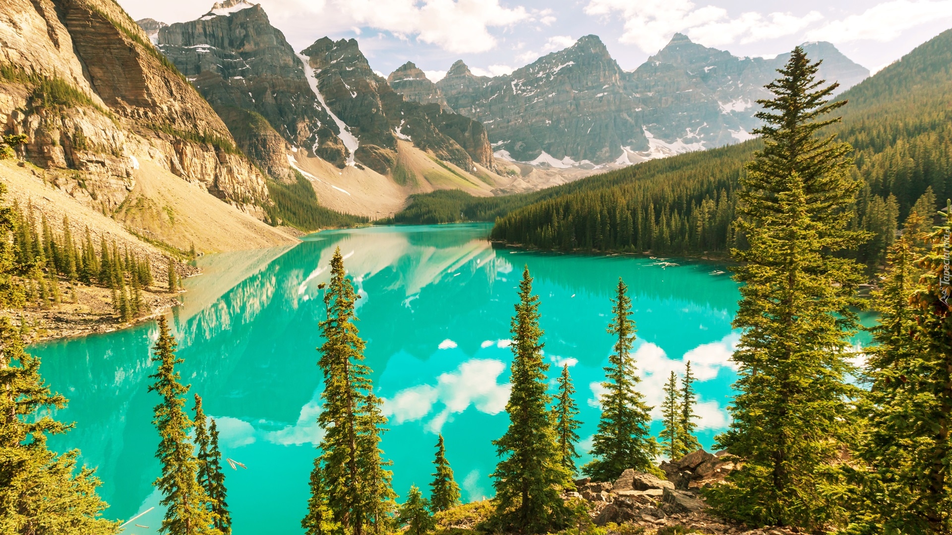 Edytor tapety: Drzewa na tle jeziora Moraine i gór