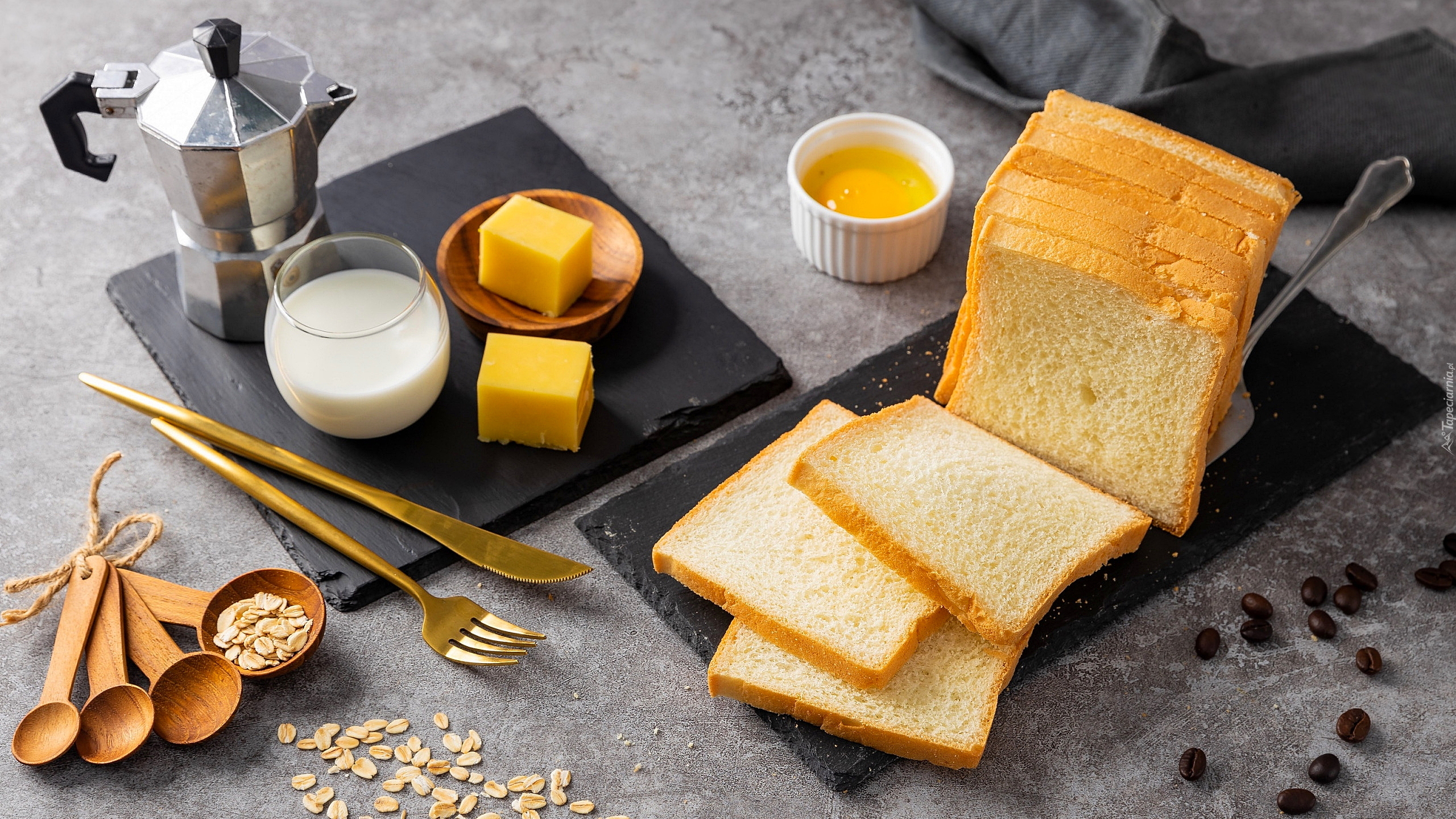 Edytor tapety: Pokrojony chleb tostowy obok żółtego sera i kawiarki