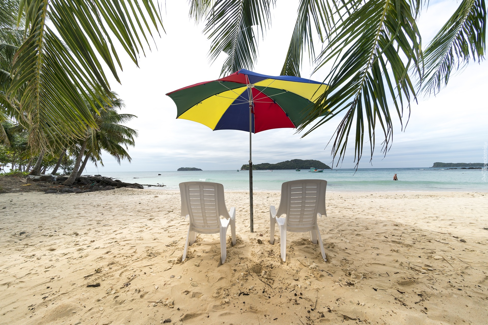 Edytor tapety: Krzesła pod kolorowym parasolem na plaży