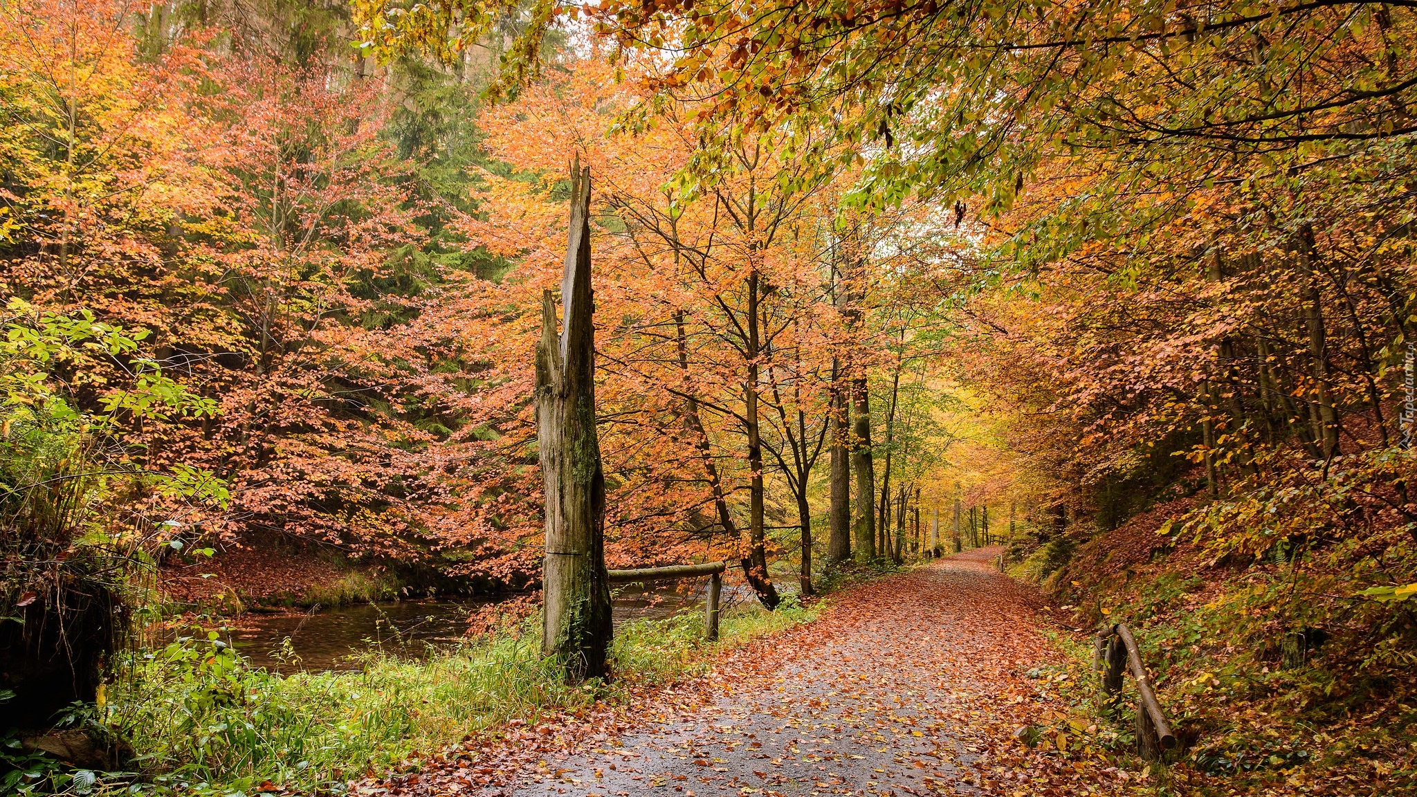 Edytor tapety: Droga obok rzeki w jesiennym lesie