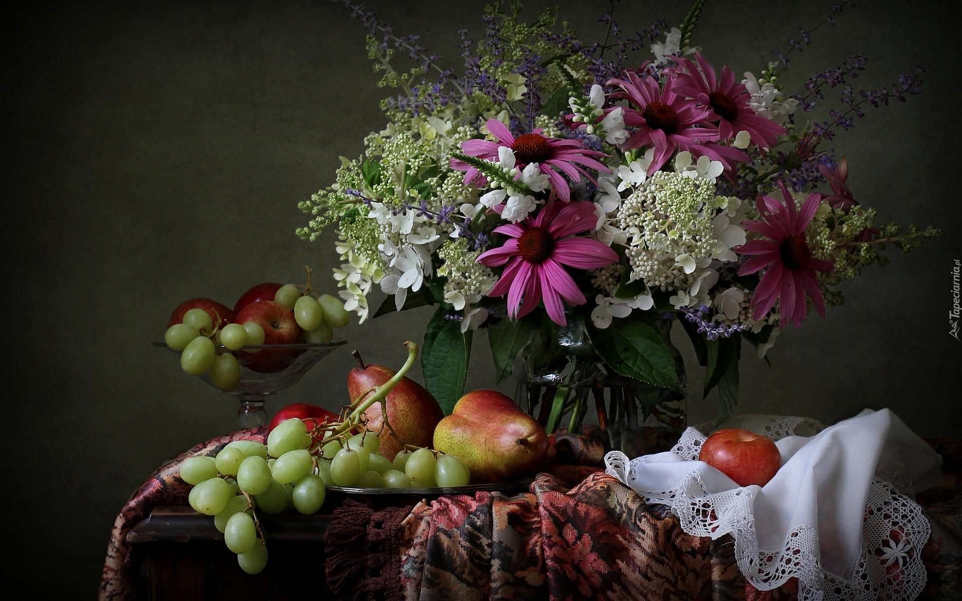 Edytor tapety: Owoce i kolorowy bukiet w szklanym wazonie