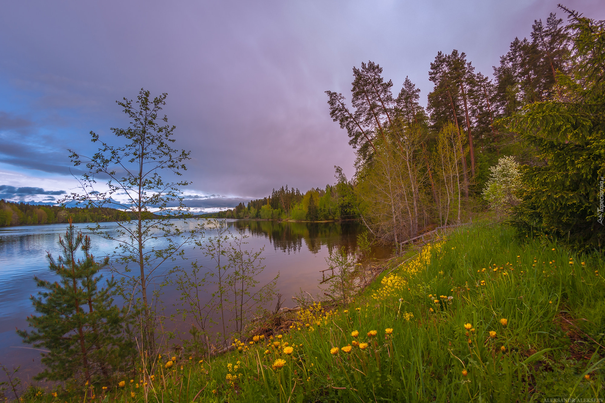 Edytor tapety: Drzewa i kwiaty w trawie na brzegu jeziora