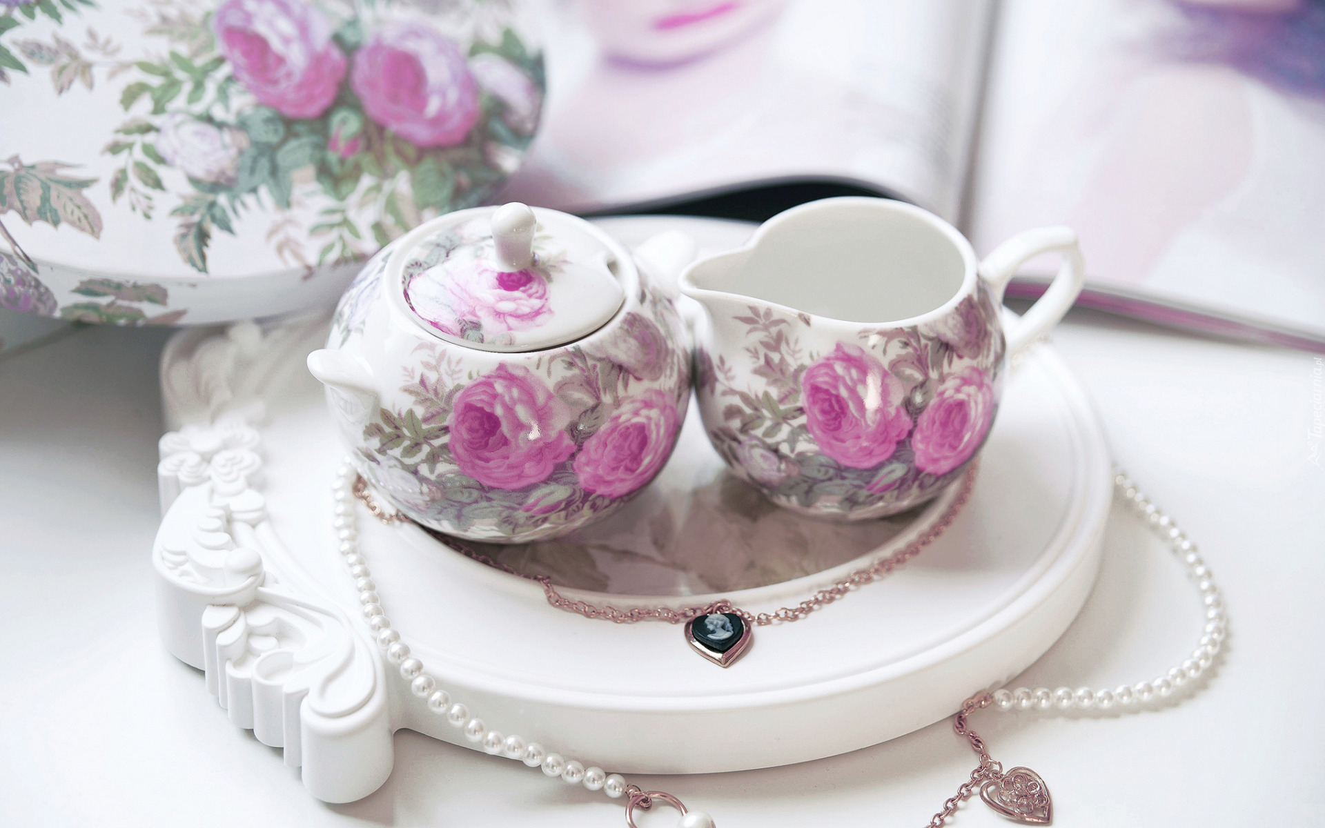 Edytor tapety: Dzbanuszek i cukiernica obok łańcuszka z wisiorkiem
