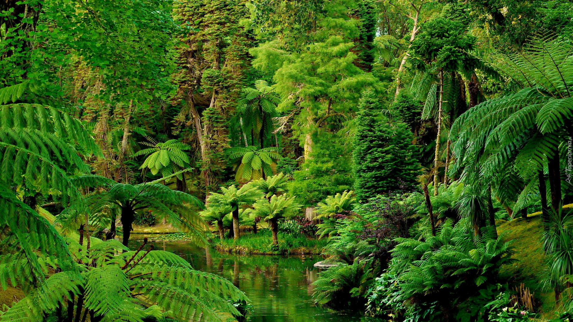 Edytor tapety: Zielone drzewa i krzewy nad stawem