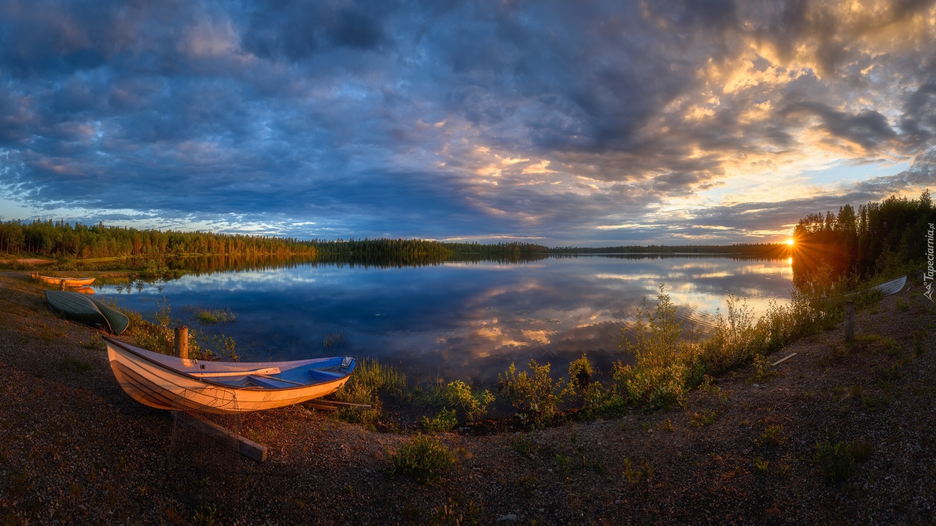 Edytor tapety: Łódki na brzegu jeziora w promieniach zachodzącego słońca