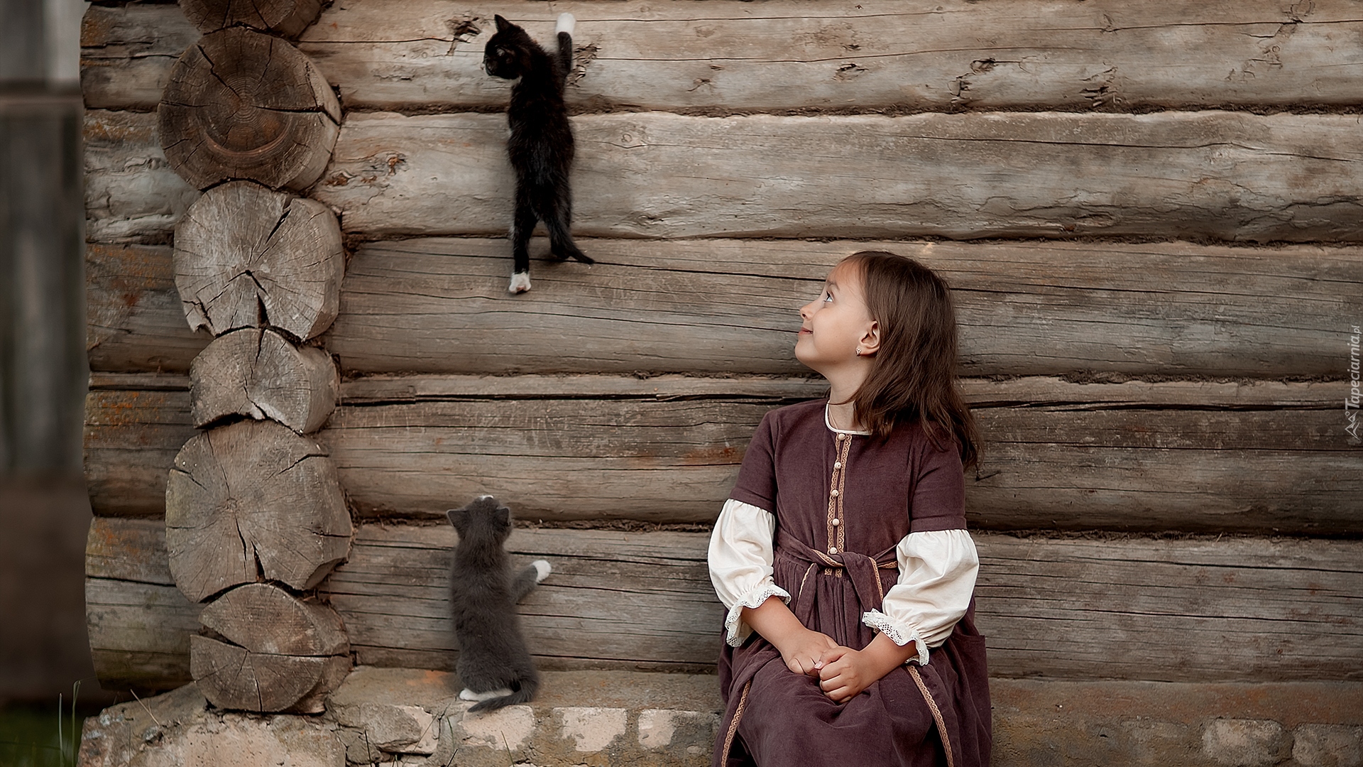 Edytor tapety: Dziewczynka patrząca na wspinające się kotki