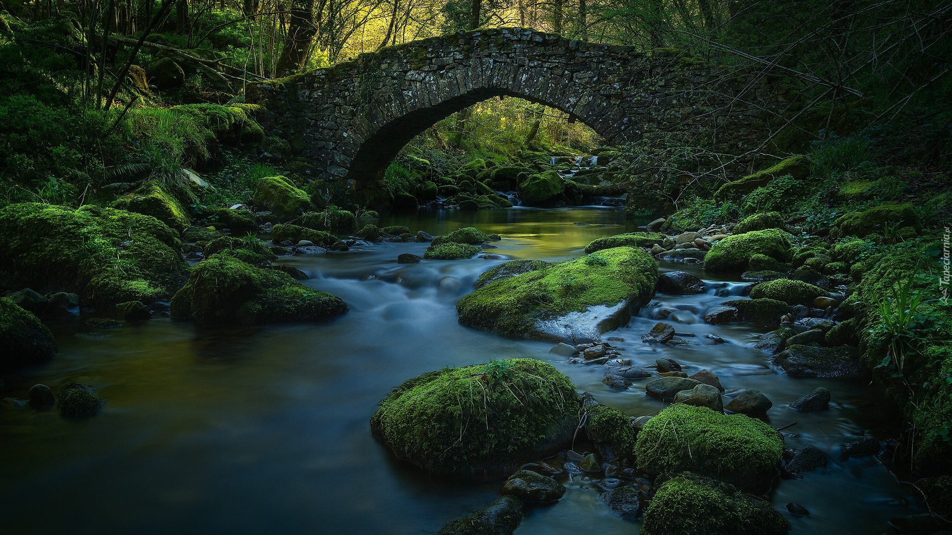Edytor tapety: Omszone kamienie w leśnej rzece obok mostu