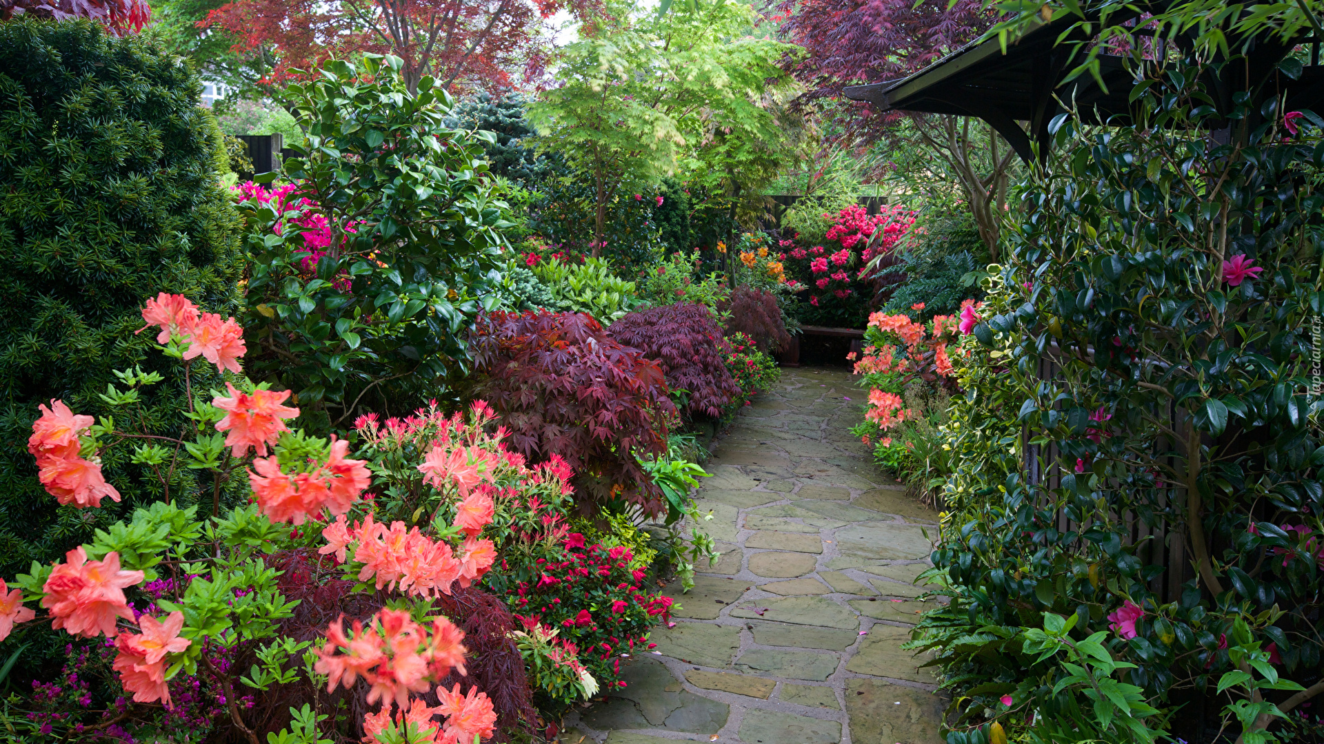 Edytor tapety: Kwitnące rododendrony w ogrodzie