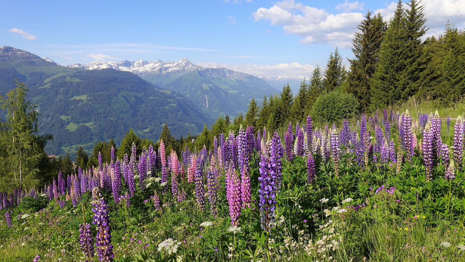 Edytor tapety: Łubin na wzgórzu i góry w tle