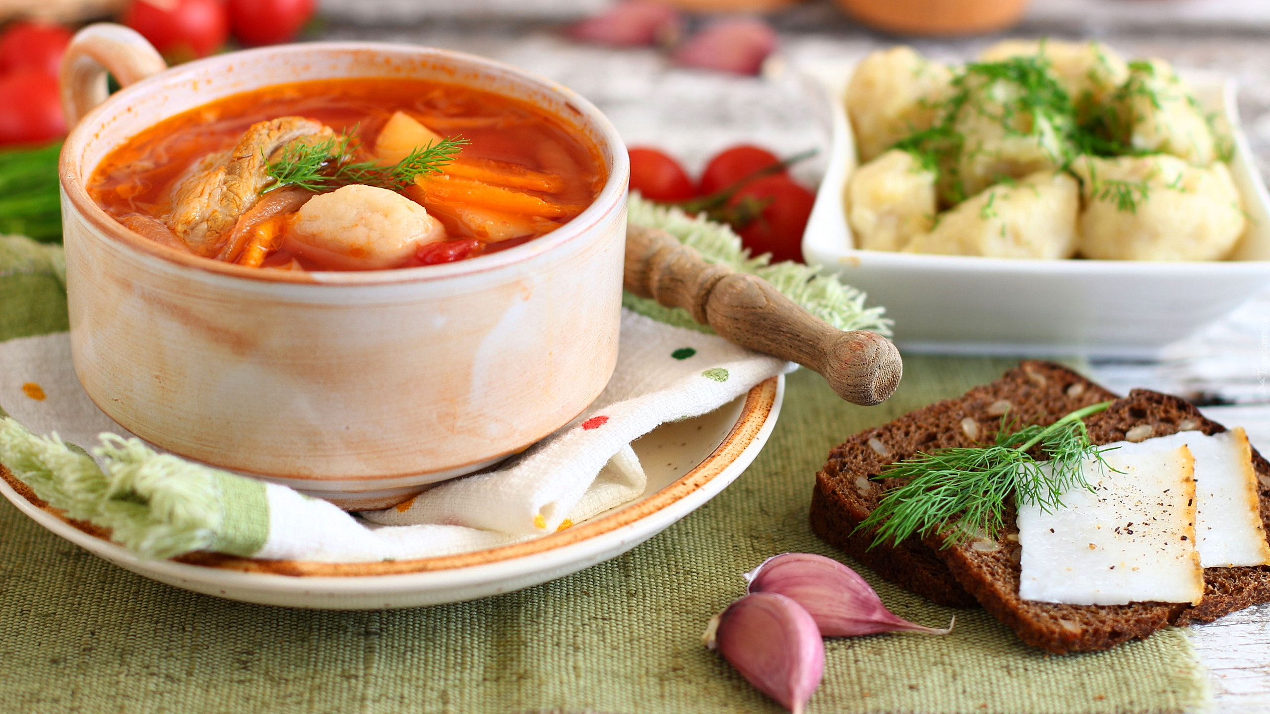 Edytor tapety: Kromki ciemnego chleba obok zupy w miseczce