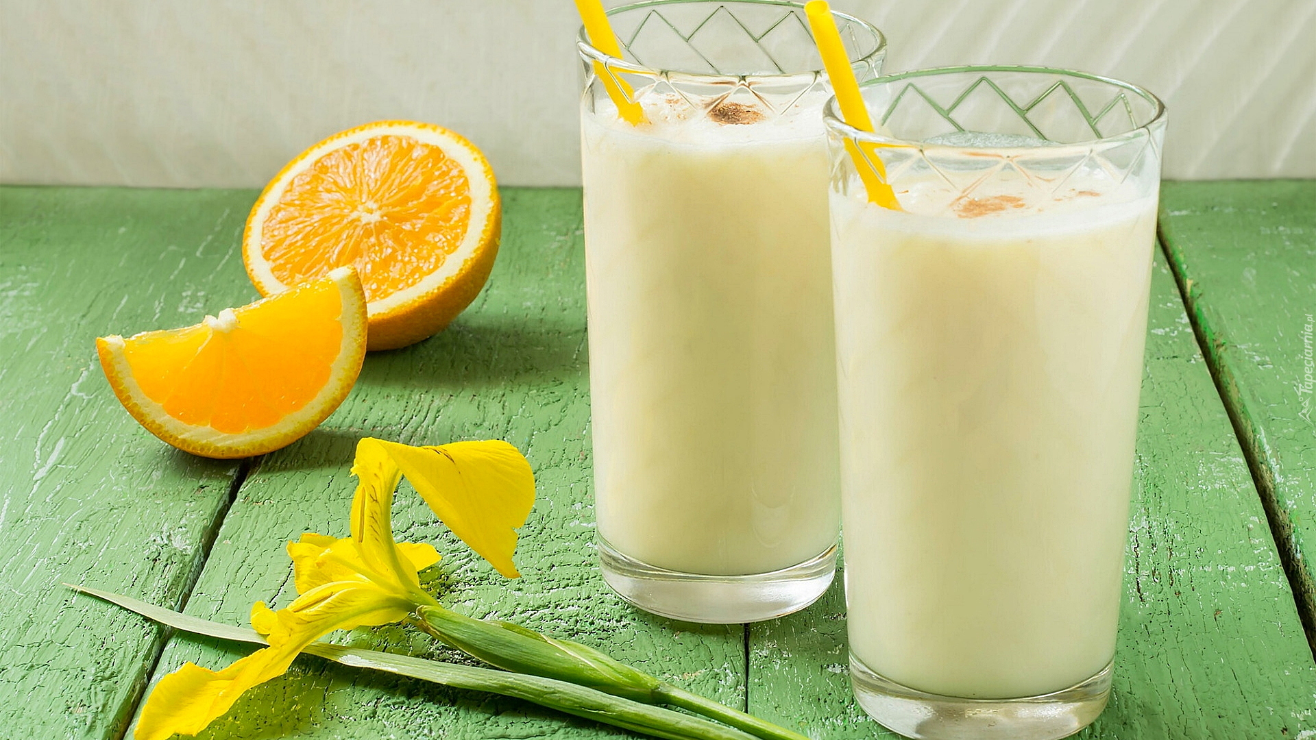 Edytor tapety: Dwie szklanki mleka obok pomarańczy i irysa
