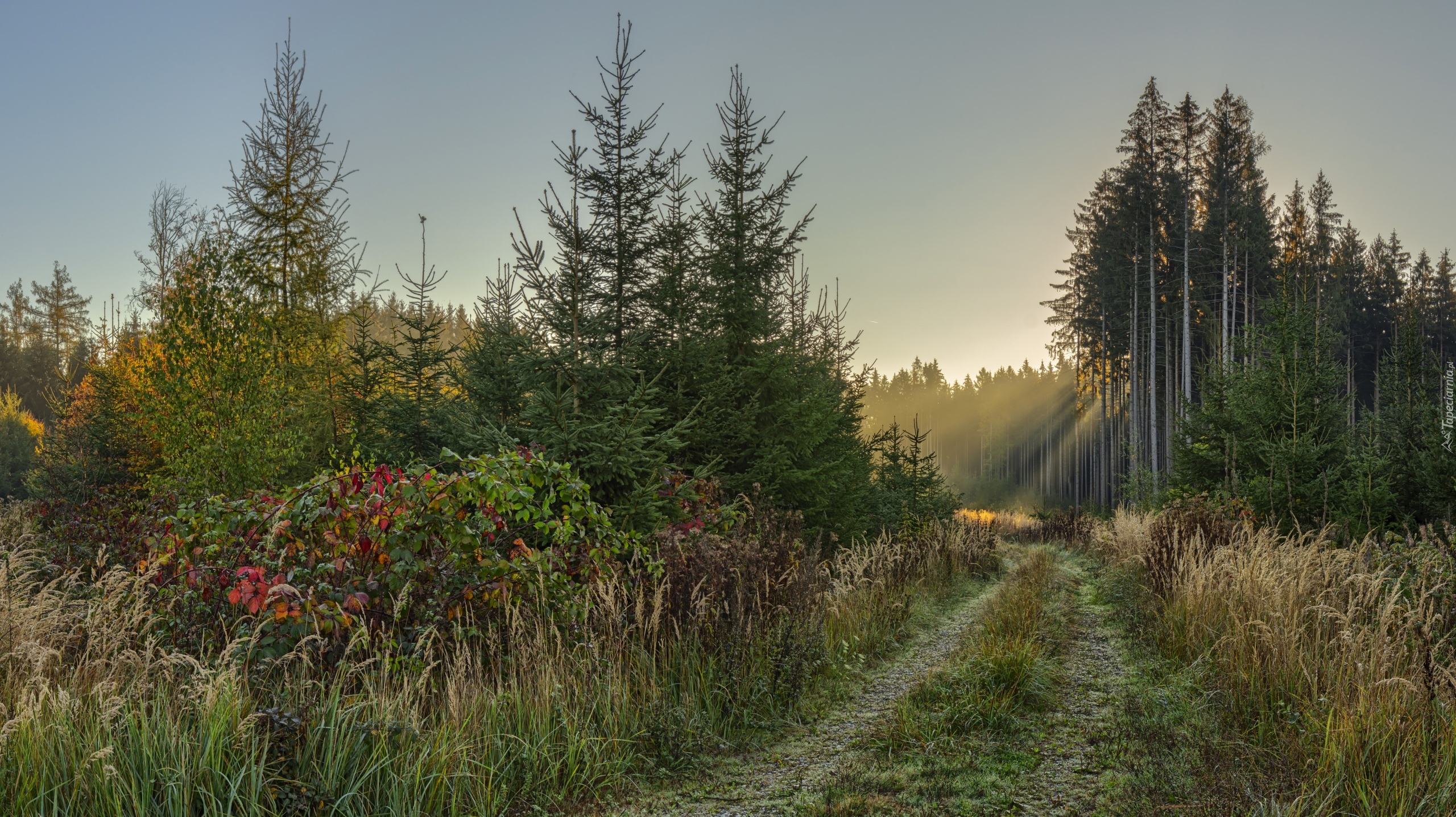 Edytor tapety: Trawy i drzewa przy drodze do lasu