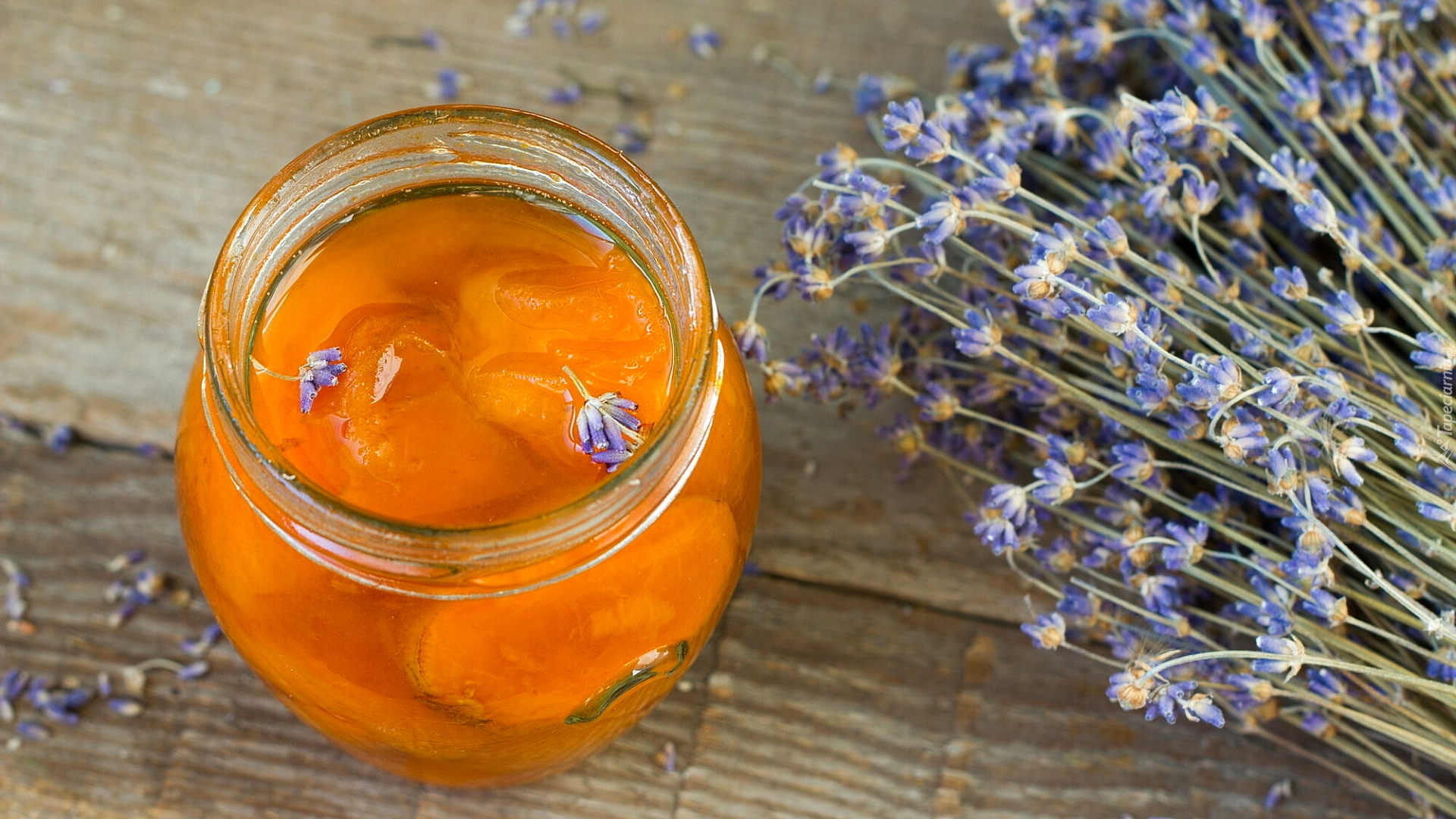Edytor tapety: Słoik dżemu morelowego obok lawendy