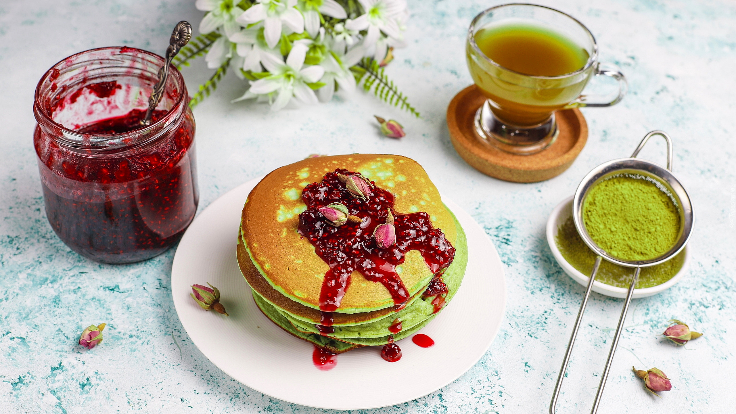 Edytor tapety: Naleśniki z dżemem ozdobione pąkami róż