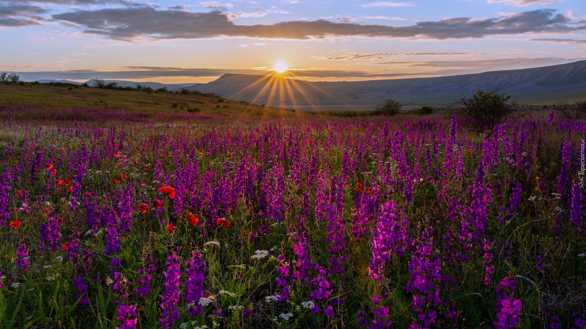 Edytor tapety: Maki i ostróżka na łące w promieniach słońca
