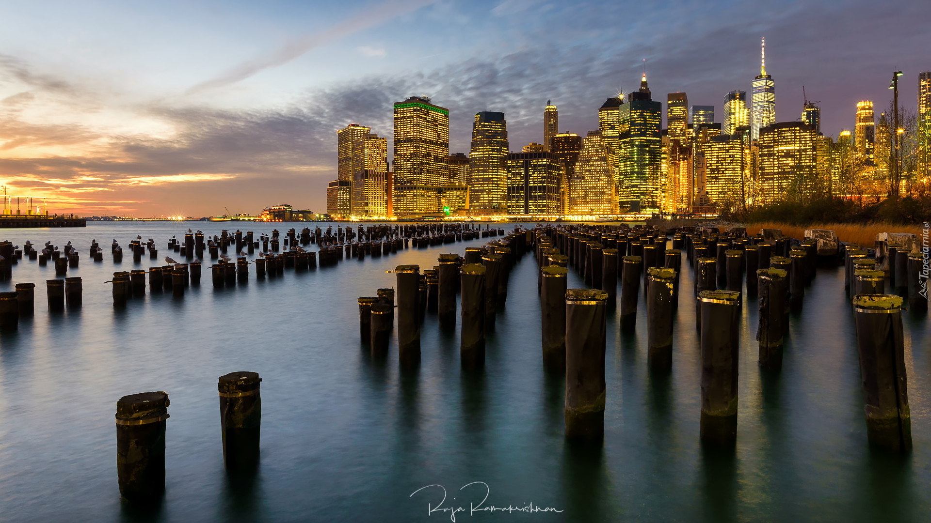 Edytor tapety: Oświetlone wieżowce Manhattanu nad cieśniną East River