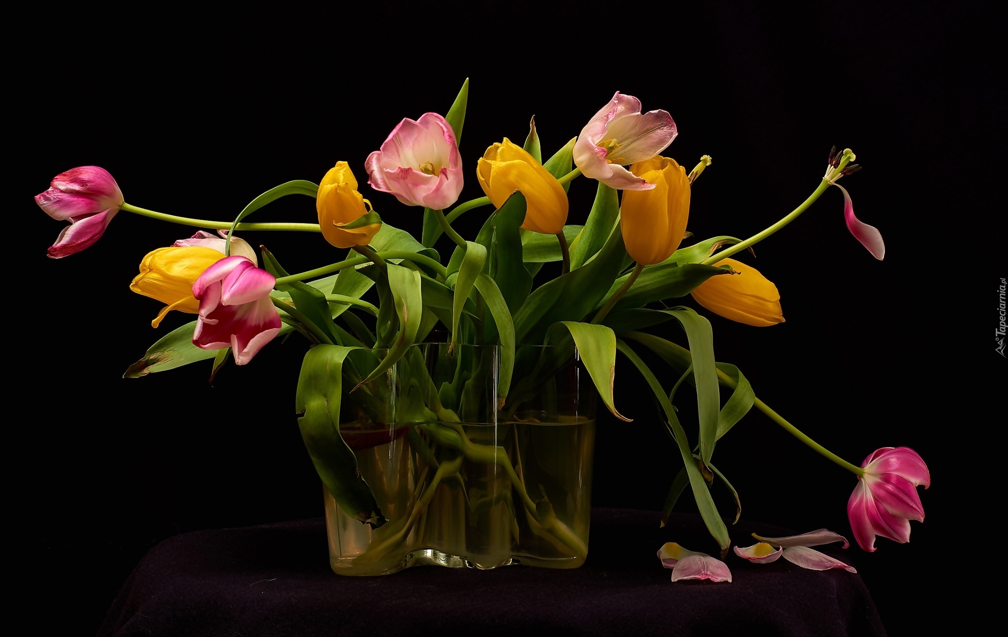Edytor tapety: Rozkwitnięty bukiet tulipanów w wazonie