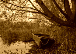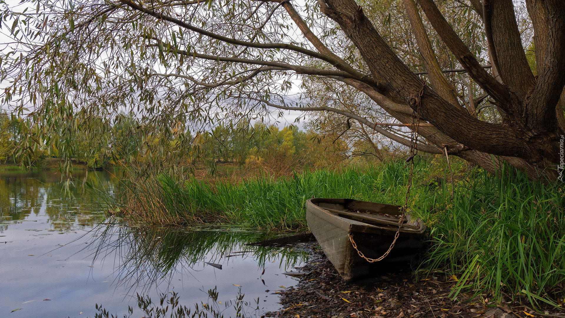 Edytor tapety: Łódka przypięta do wierzby na brzegu jeziora