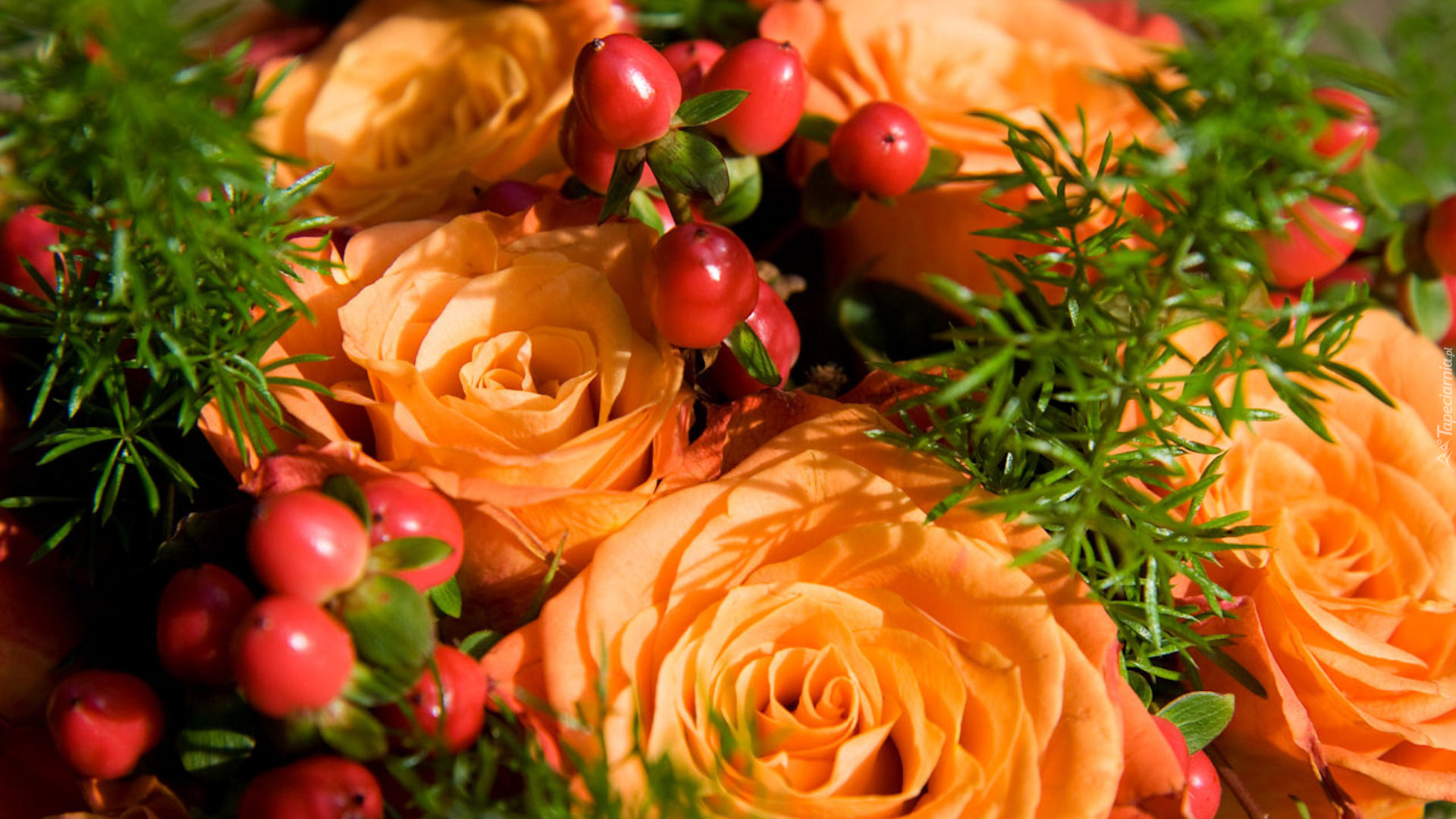 Edytor tapety: Asparagus pośród pomarańczowych róż i czerwonych jagód