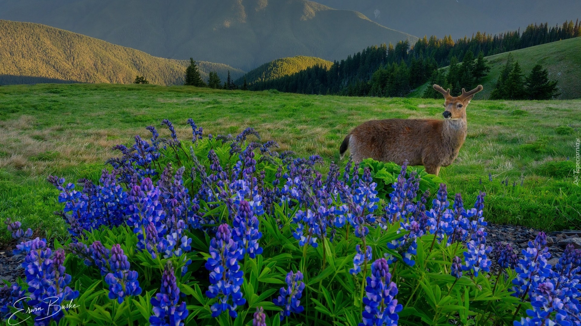 Edytor tapety: Jelonek obok kępy łubinu