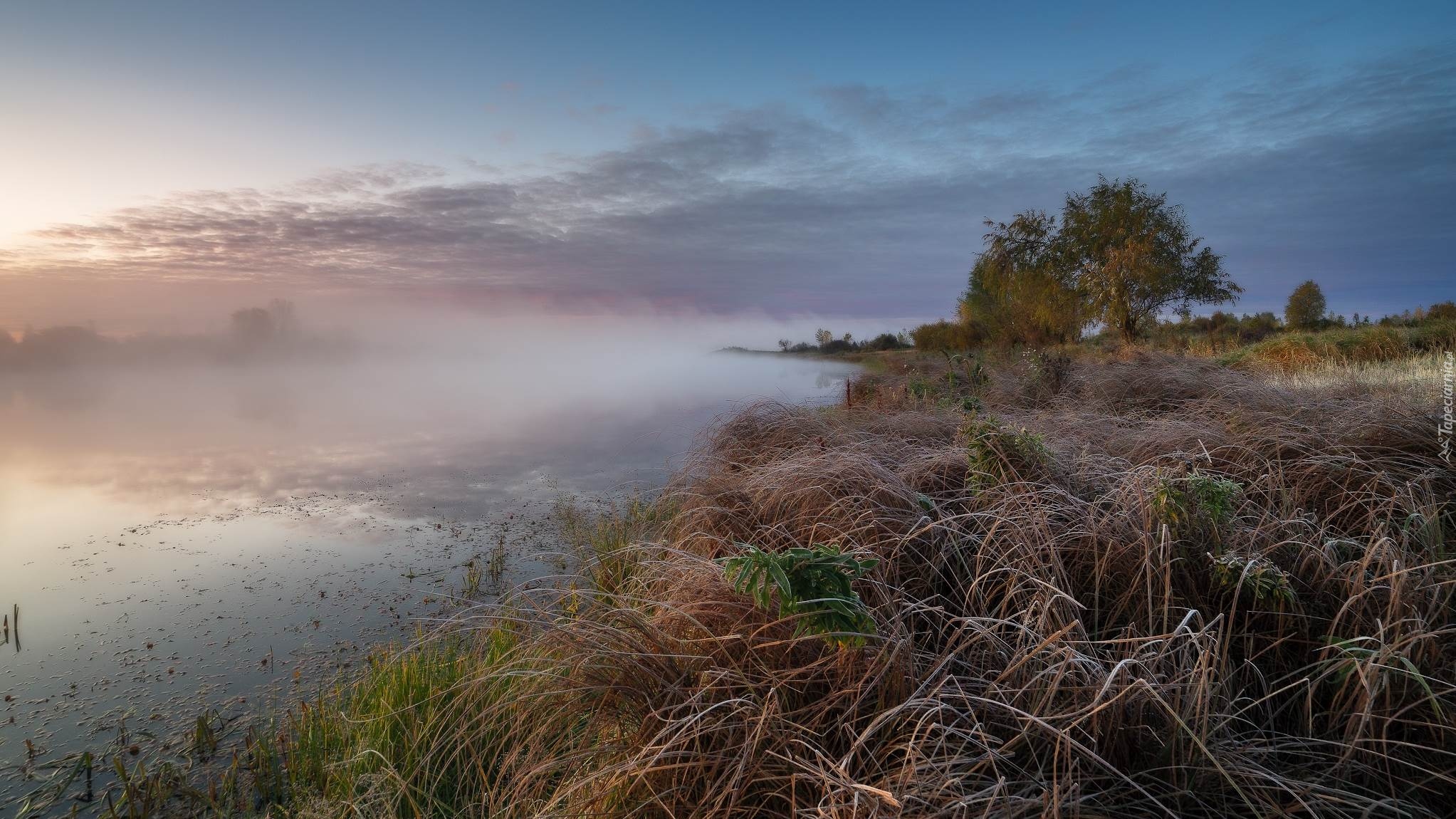 Edytor tapety: Suche trawy na brzegu zamglonego jeziora