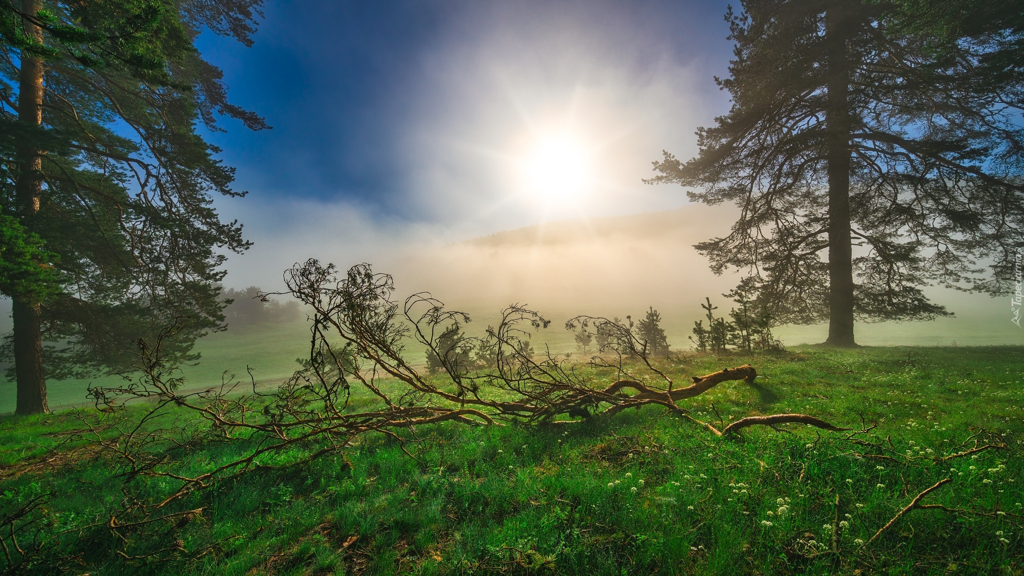Edytor tapety: Konar między drzewami na zamglonej polanie