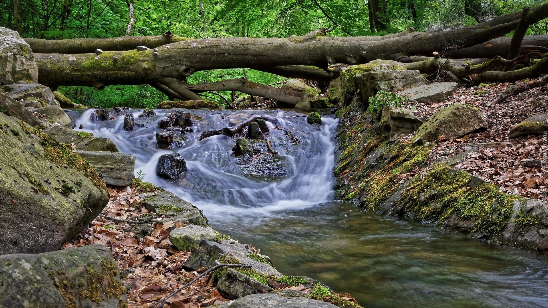 Edytor tapety: Powalone drzewo nad leśną rzeką