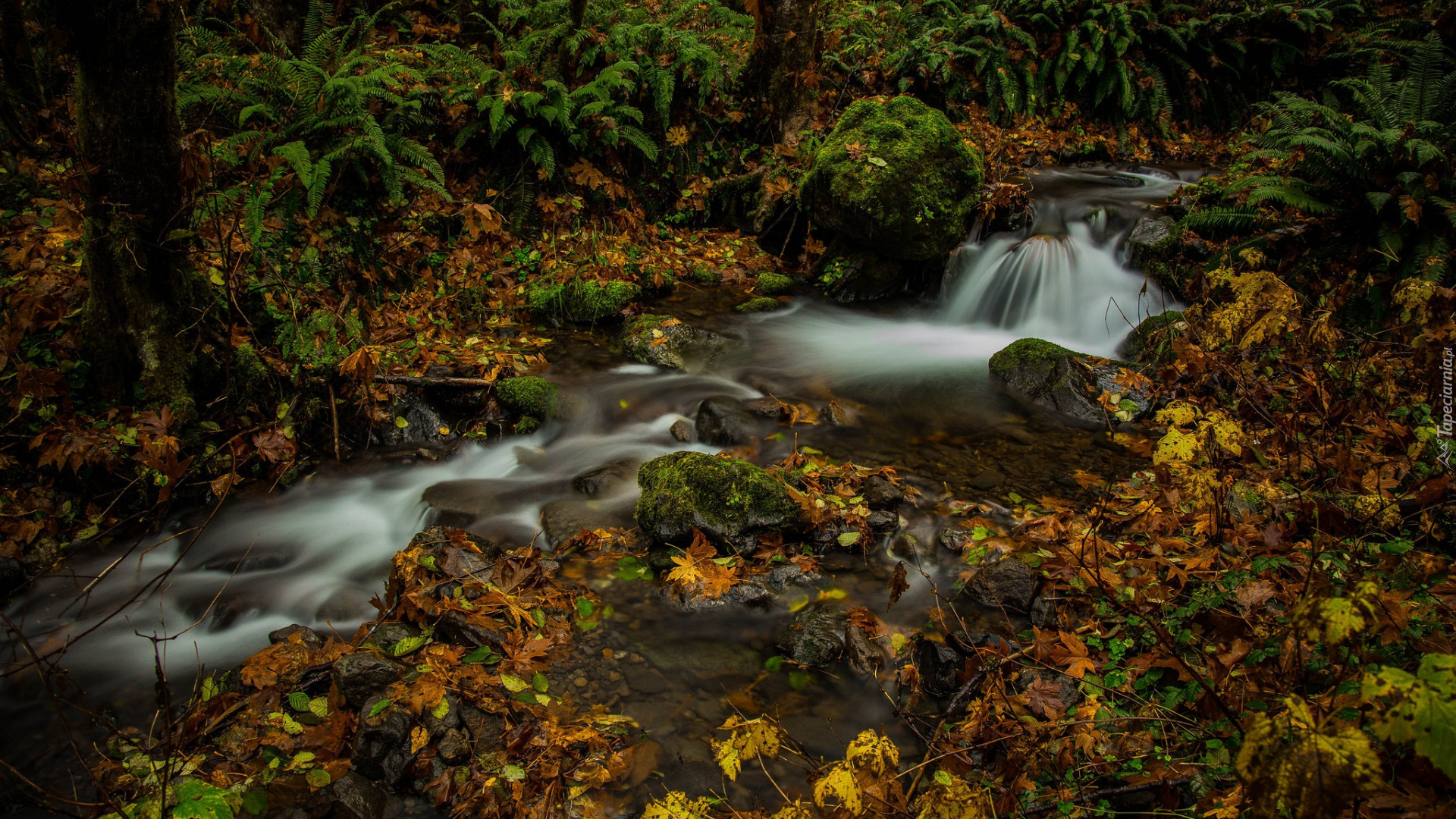 Edytor tapety: Opadłe liście i paprocie przy leśnym strumieniu