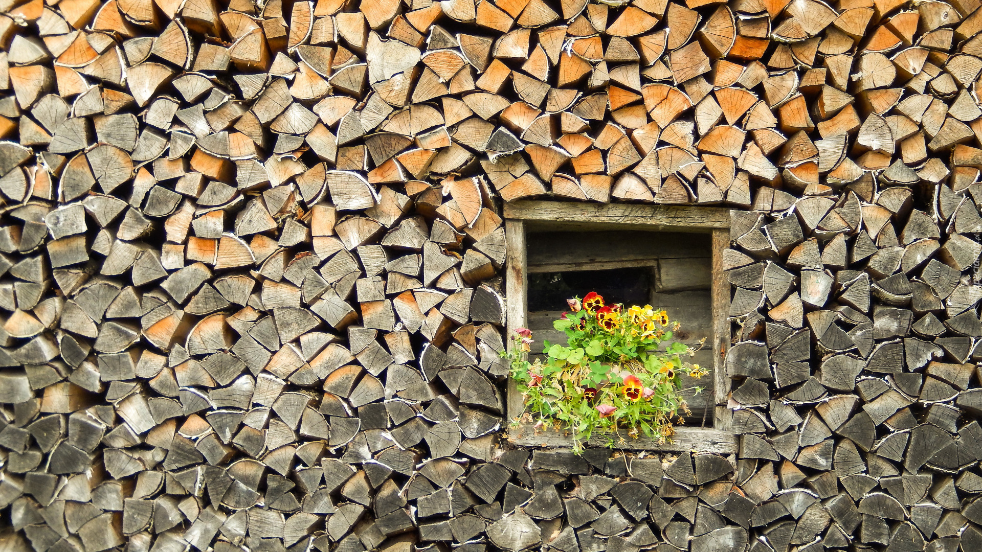 Edytor tapety: Bratki w okienku ułożonych drewnianych polan
