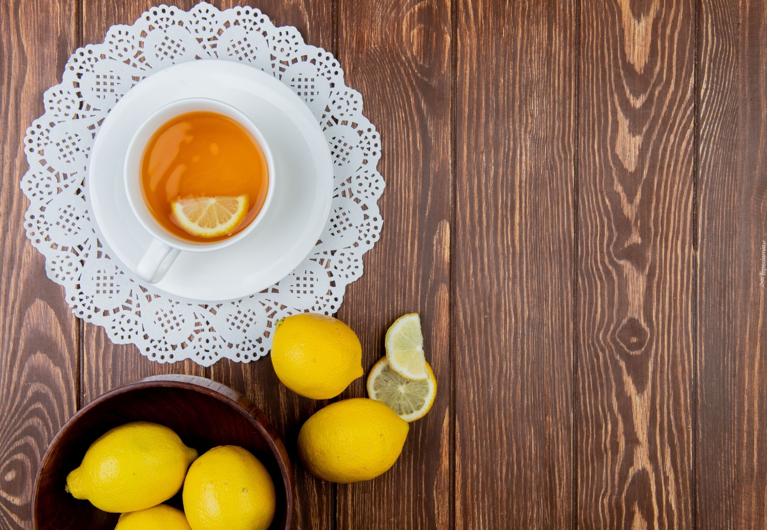 Edytor tapety: Filiżanka herbaty na serwetce obok cytryn