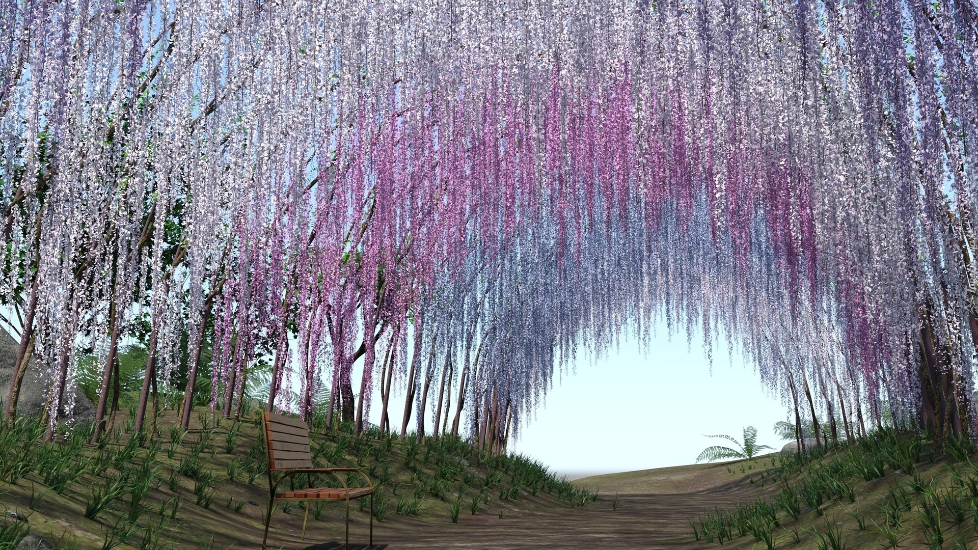 Edytor tapety: Glicynia nad ławeczką przy drodze