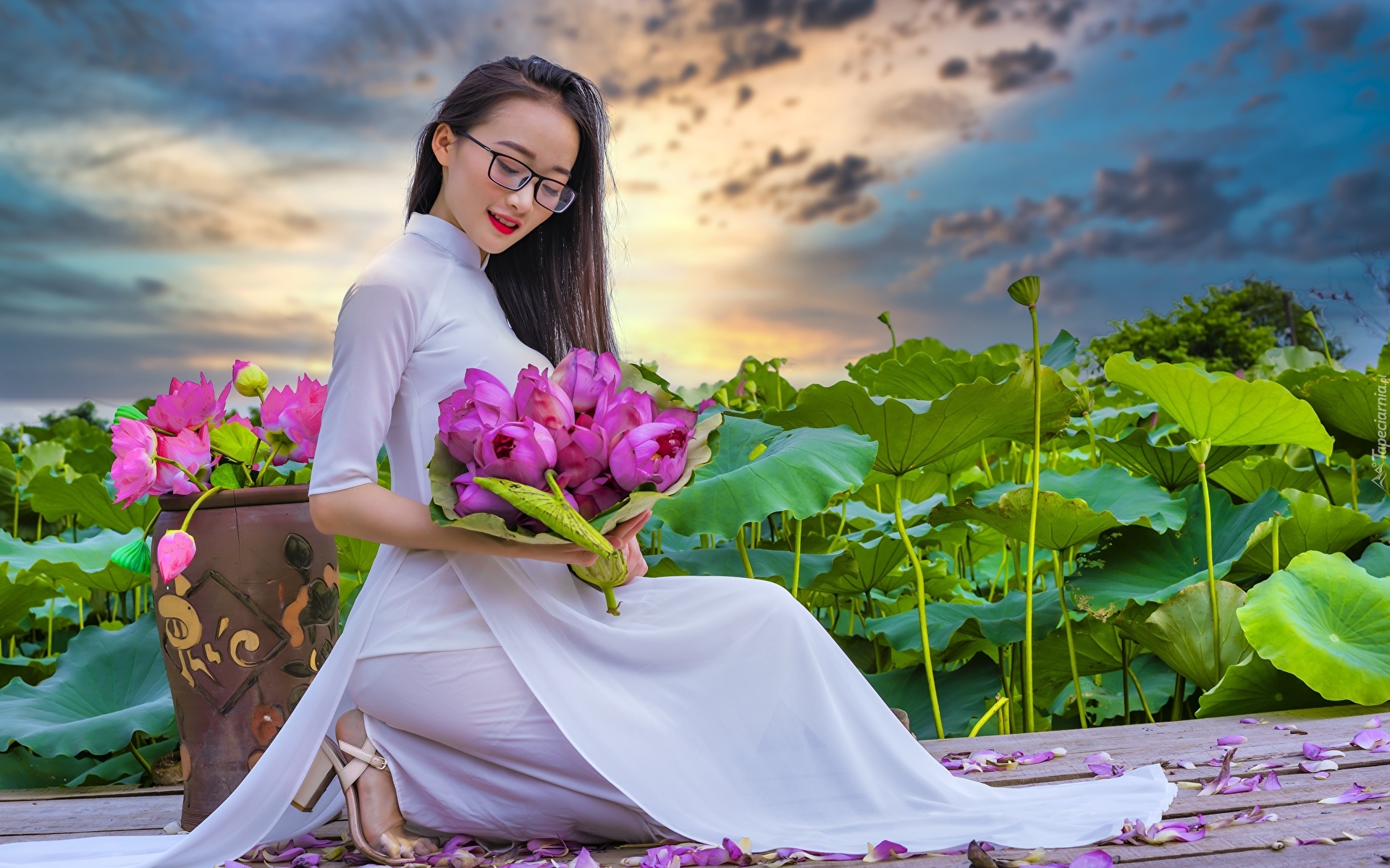Edytor tapety: Dziewczyna w białej sukience z bukietem lotosów