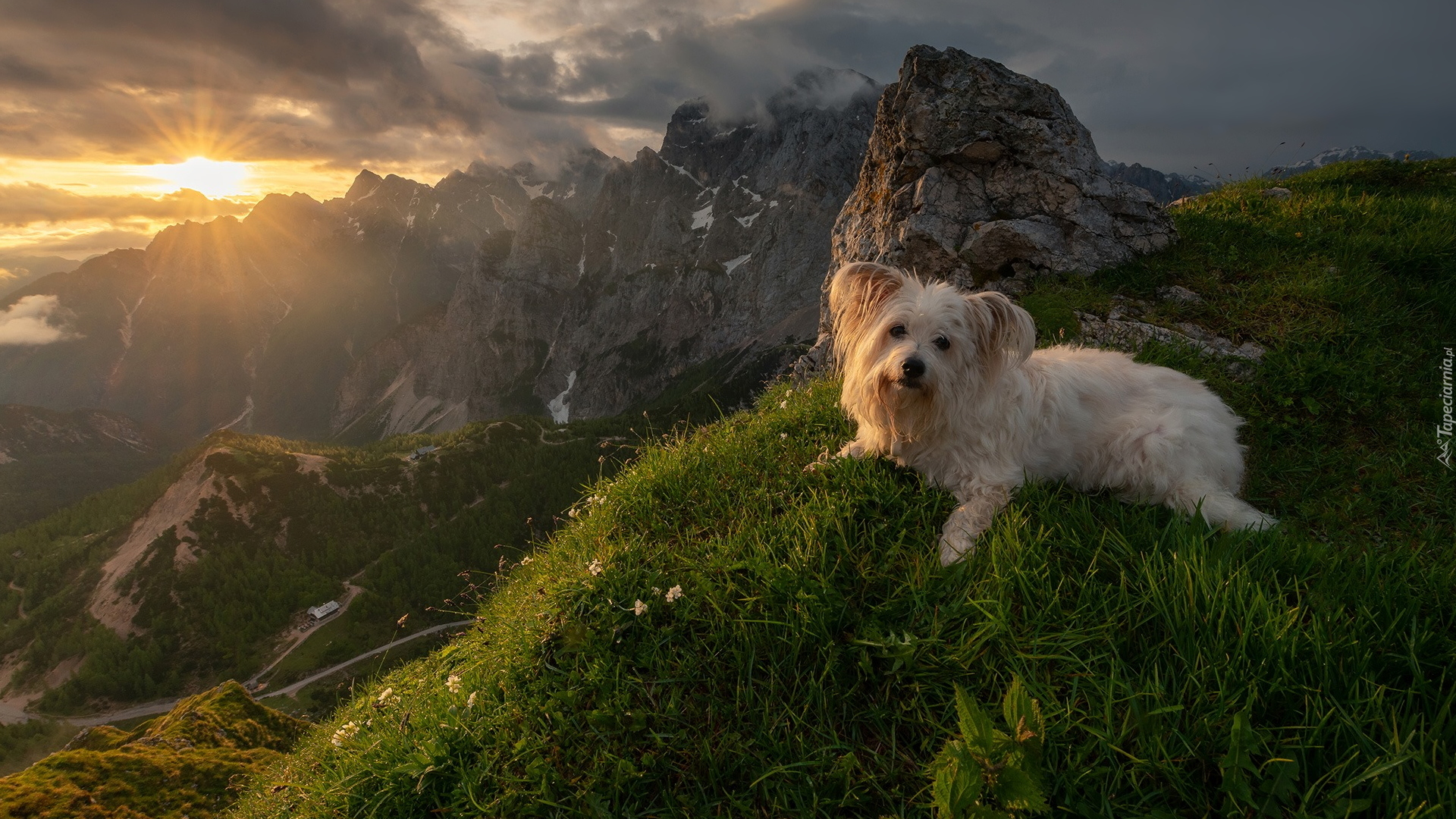Edytor tapety: Pies na trawie i Alpy Julijskie w tle