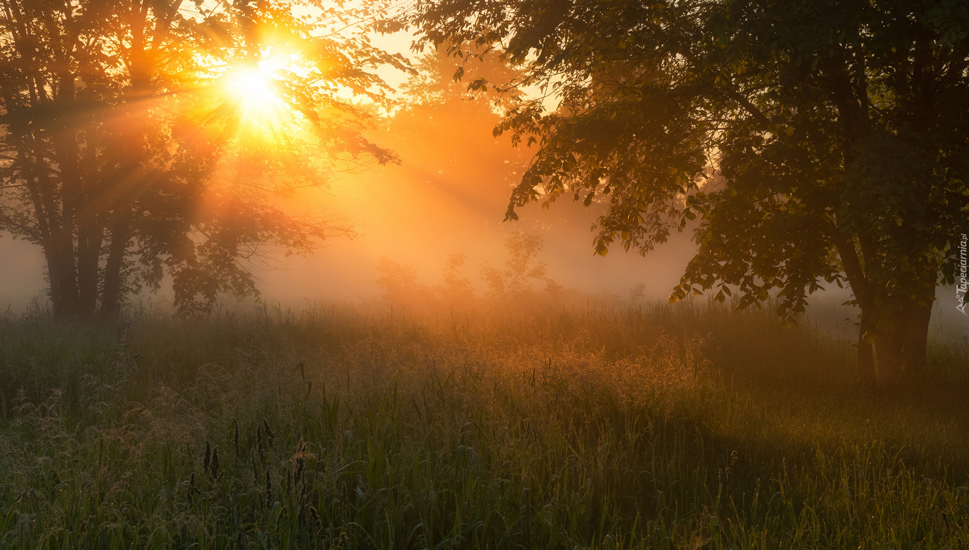 Edytor tapety: Drzewa rozświetlone promieniami słońca