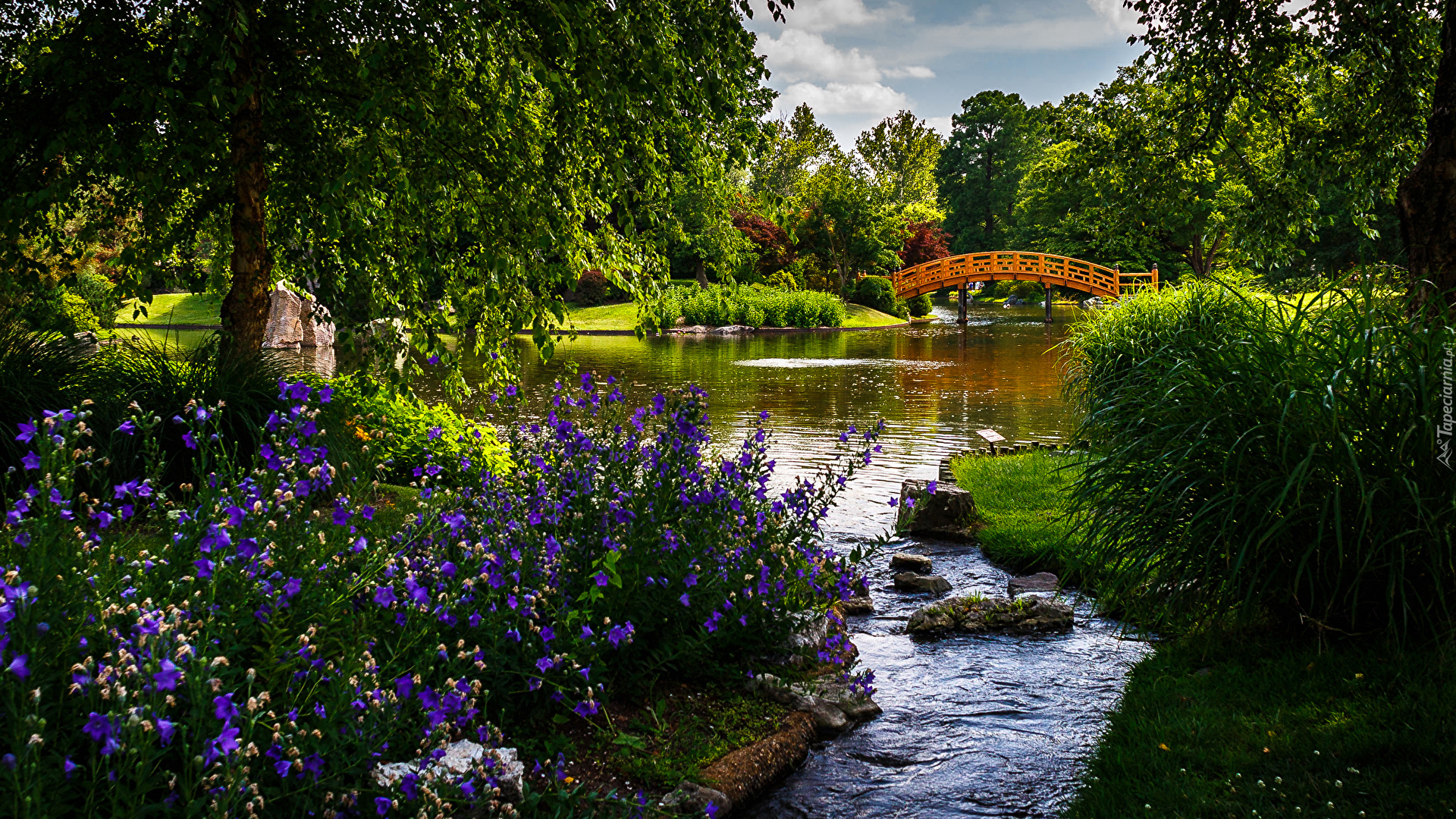 Edytor tapety: Kwiaty pod drzewami i mostek nad stawem