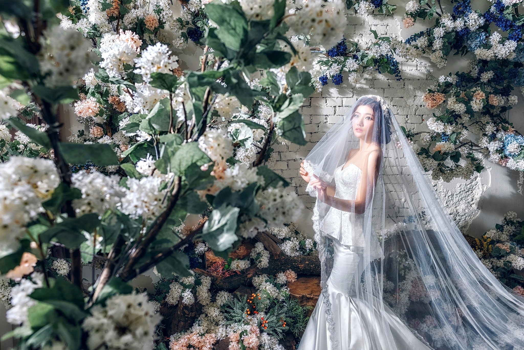 Edytor tapety: Azjatka w sukni ślubnej z długim welonem