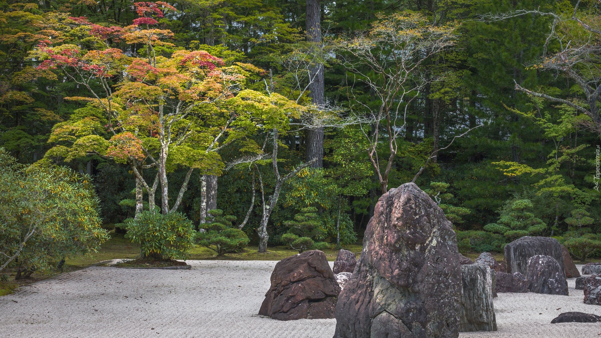 Edytor tapety: Kamienne głazy obok kolorowych drzew