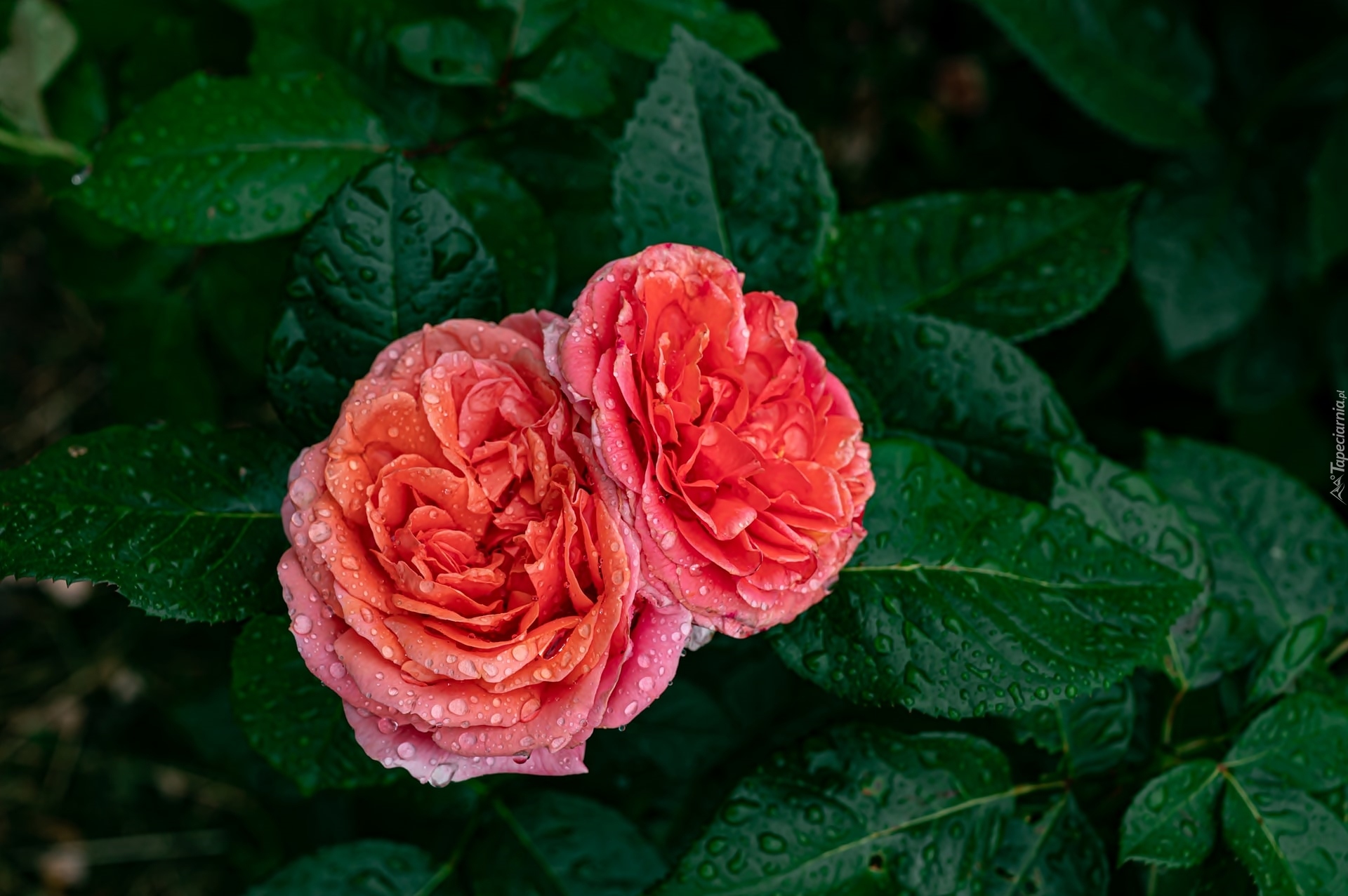 Edytor tapety: Dwie zroszone róże z liśćmi