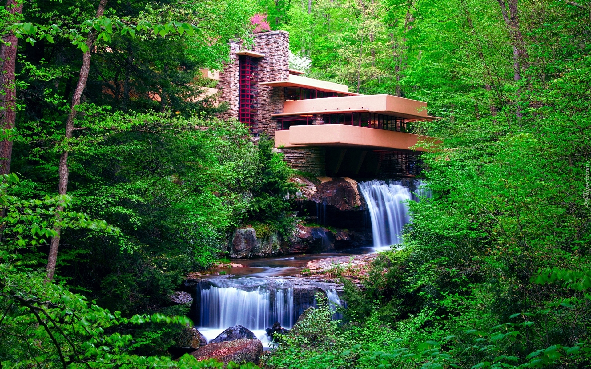 Edytor tapety: Dom nad wodospadem w lesie