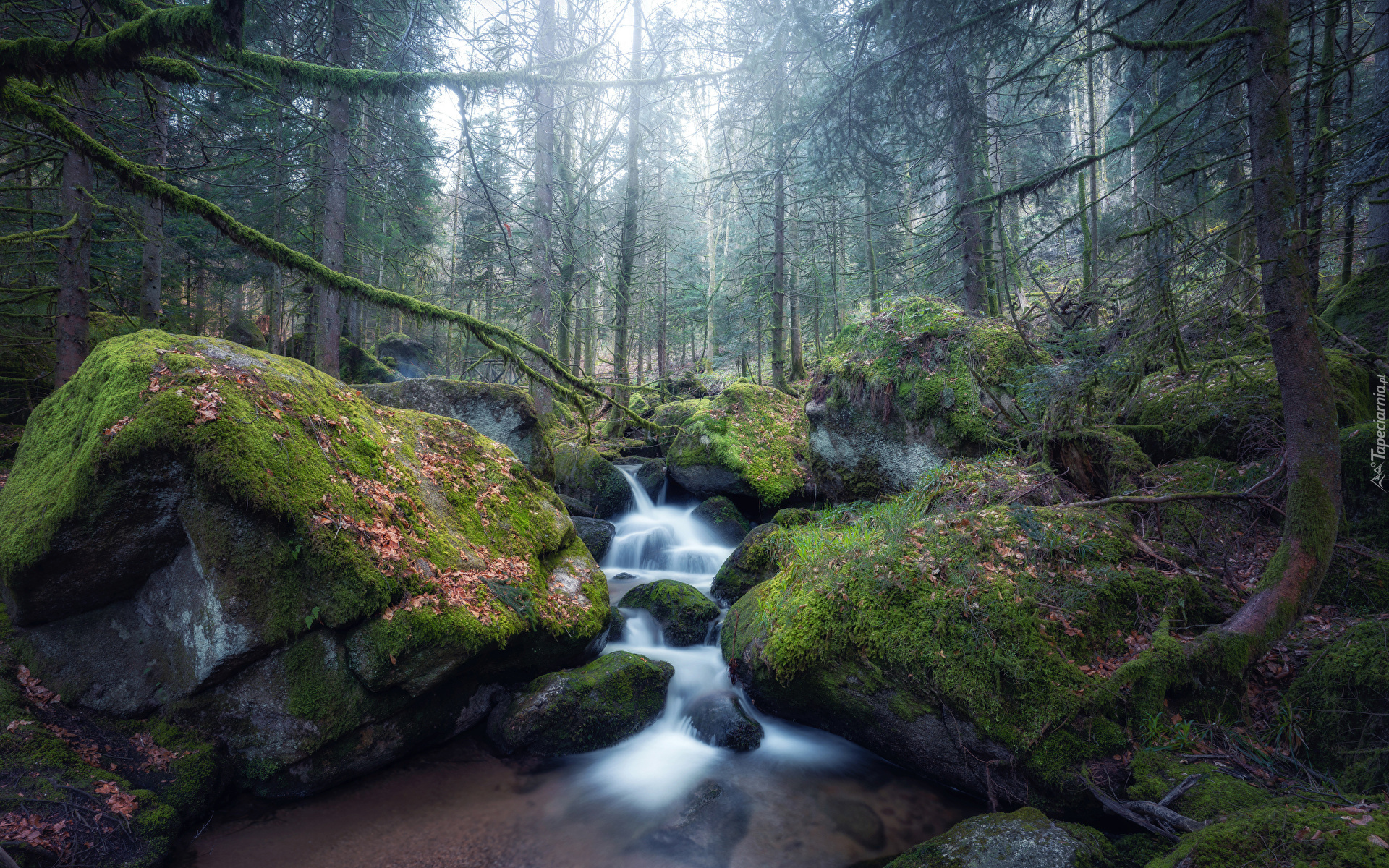 Edytor tapety: Omszałe głazy przy leśnym strumieniu