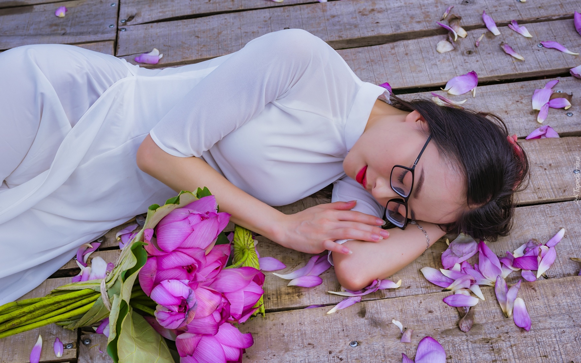 Edytor tapety: Azjatka z bukietem lotosu na podeście